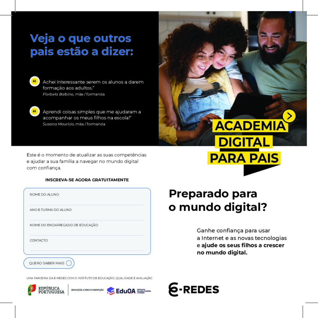 A nossa escola está a promover a Academia Digital para Pais, uma oportunidade de formação dirigida a todos os encarregados de educação que desejem reforçar as suas competências digitais.