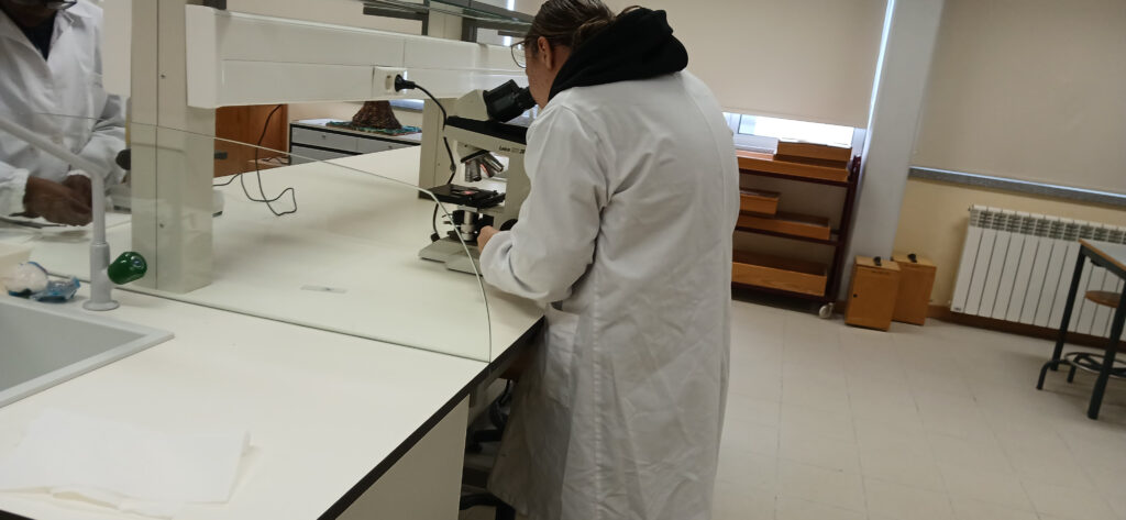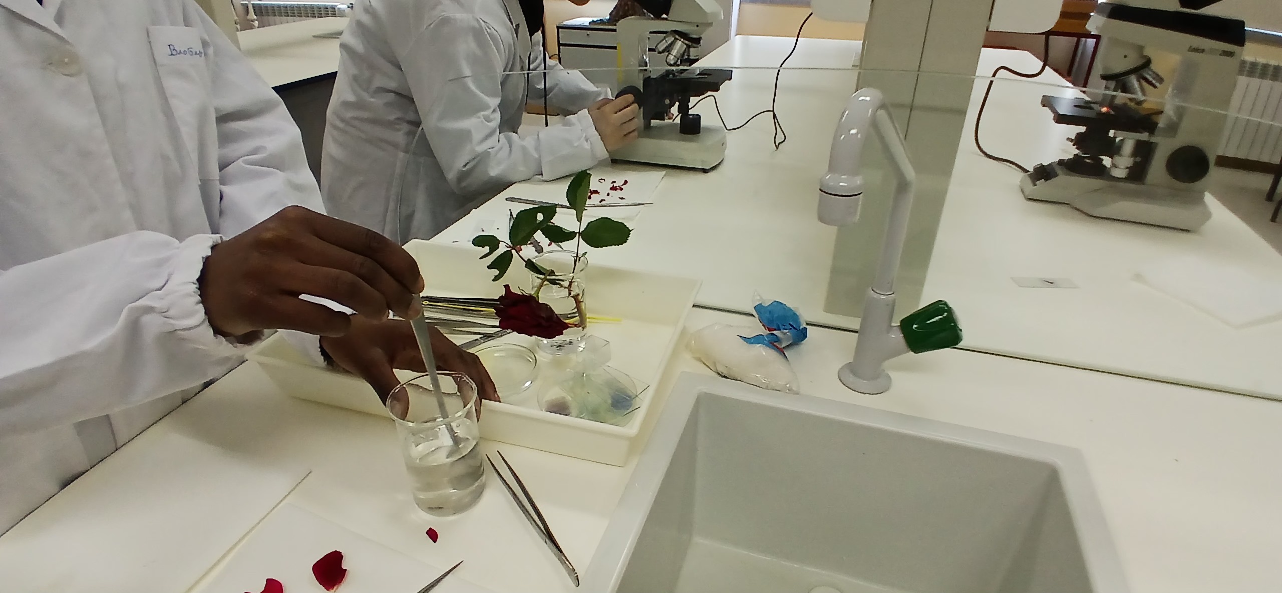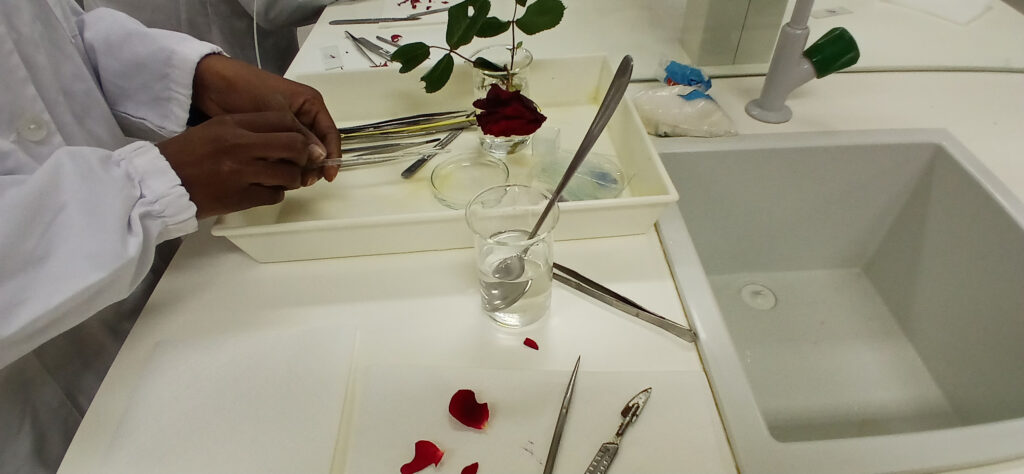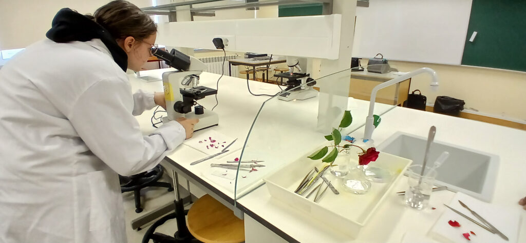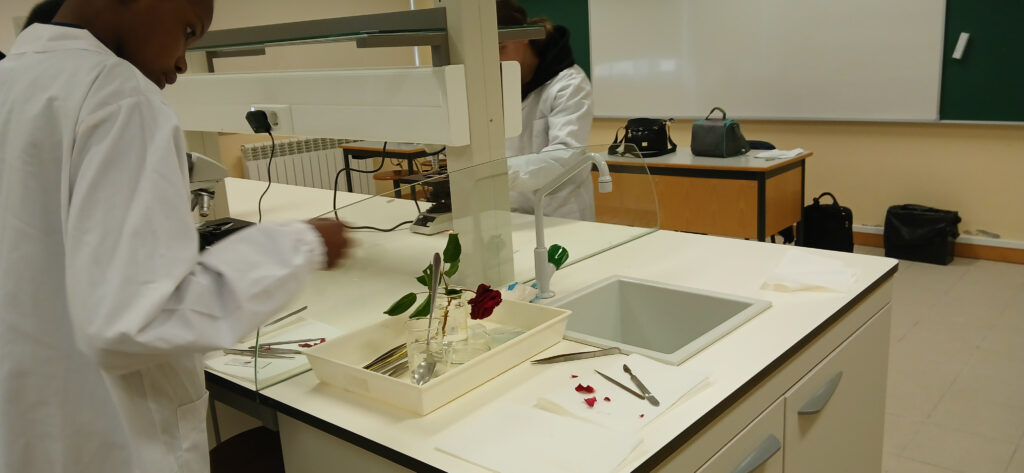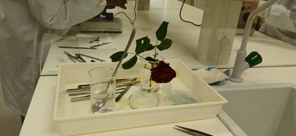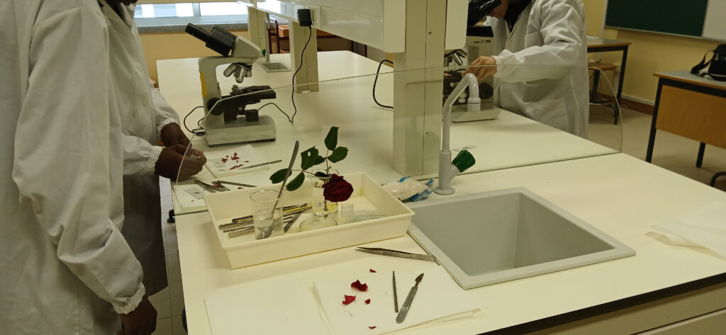 O clube de Ciência Viva desenvolveu a atividade de observação de células das pétalas de uma rosa ao microscópio ótico. Aplicaram as técnicas de corte fino e de montagem de preparações extemporâneas.